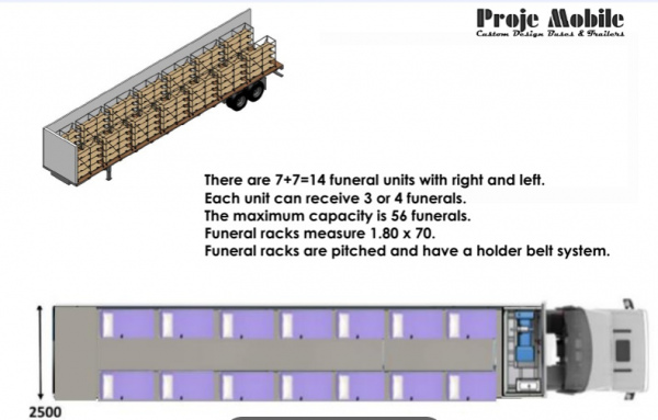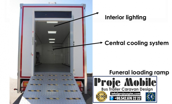 Mobil Morg araçları imalatı proje yapım firması tarafından Mobil Morg otobüs veya Mobil Morg treyler formatlı yapılmaktadır. Mobil Morg karavanı projeleri tamamen özel dizayn edilen Mercedes yada MAN marka otobüslerimizin üzerine veya şaseden imalat Mobil Morg treyler formatında üretilmektedir. Mobil Morg İmalatı anahtar teslim tüm medikal tıbbi malzemeler dahil olarak fabrikamızda imal edilmektedir. Gezici Mobil Morg araçlar özel imalat şaseler üzerine özel mühendislik projeleri ile iklimlendirme, ses ve ısı izolasyonu gibi tüm mühendislik projeleri dahilinde fabrikamızda tek tek özel üretim olarak yapılmaktadır.